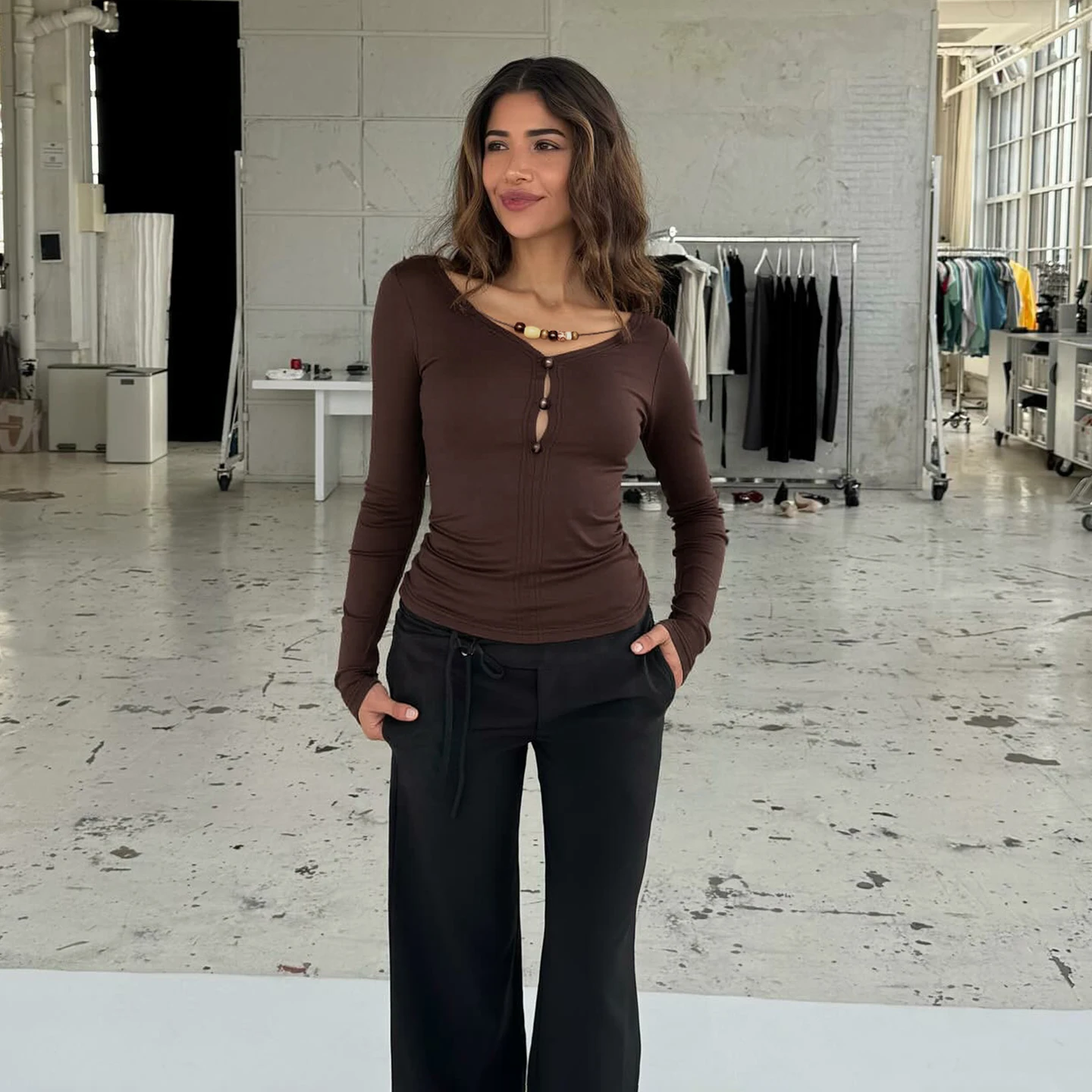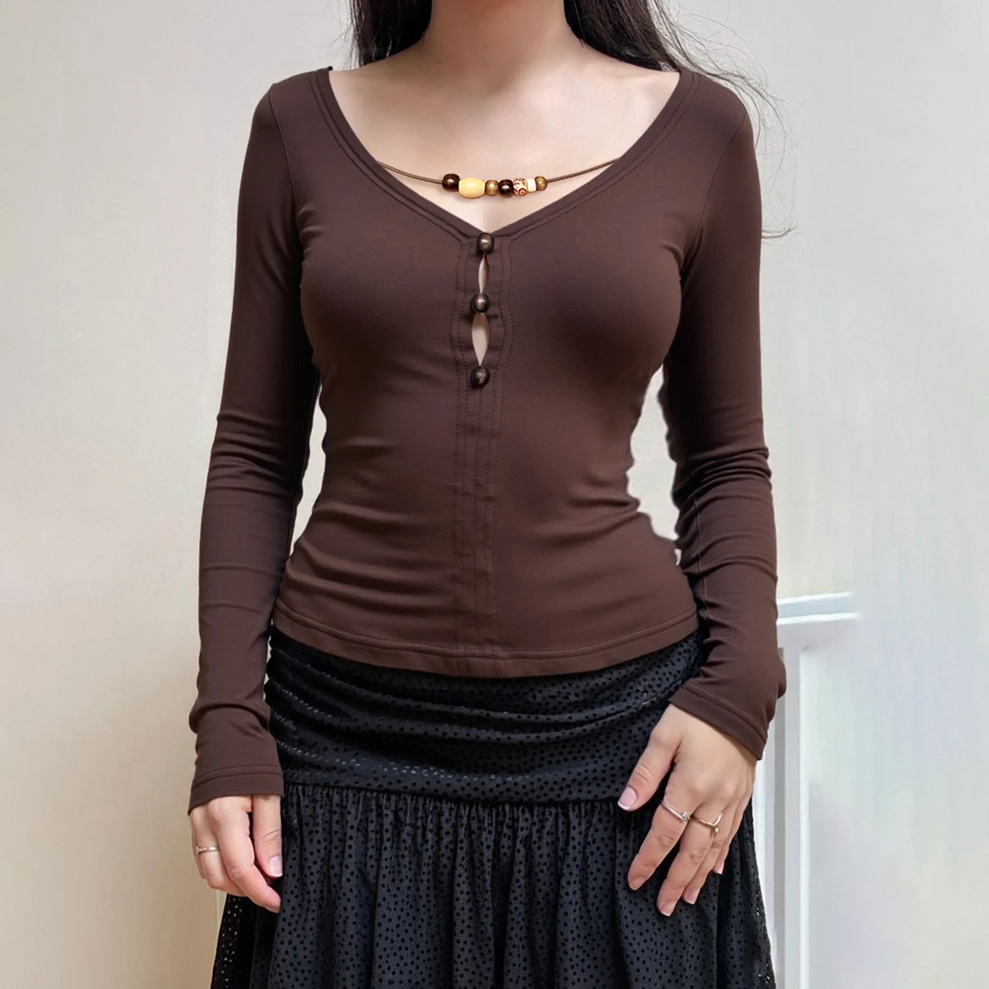 Women's Brown V-Neck Long Sleeve Fitted Knit Top with Beaded Cord and Button Front 2026 Comfortable Daily Wholesale Supplier